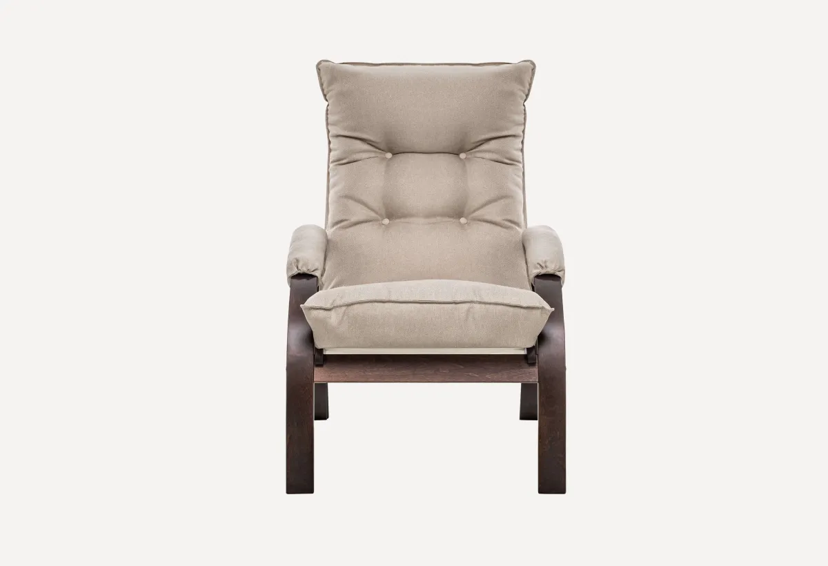 Кресло-трансформер Лесет LevadaМягкое кресло для отдыха дома и на даче Левада сделает комфортным интерьер комнаты модерн или хай-тек. Стильные кресла трансформеры из гнутоклееной коллекции мягкой мебели Leset имеют характерный силуэт, функциональны и компактны, поэтому популярны среди самых требовательных покупателей. Кресло-стул с подлокотниками и уютным сиденьем уместно в спальне, гостиной, прихожей, на балконе, в закрытой дачной беседке. У основания кресло раскладное и оснащено механизмом гребенка, за счет чего одним движением спинка переключается в 2 положения: сидя или полулежа. Этим модель напоминает шезлонг, но Левада Leset -полноценное интерьерное кресло для отдыха с современном дизайне: изящный деревянный каркас под итальянским лаком, велюровый чехол, наполнитель из эластичного пенополиуретана. Накладки на подлокотниках снимаются для чистки, приспинная подушка декорирована пуговицами. Эргономичное каркасное кресло-раскладушка выдержит до 120 кг.
