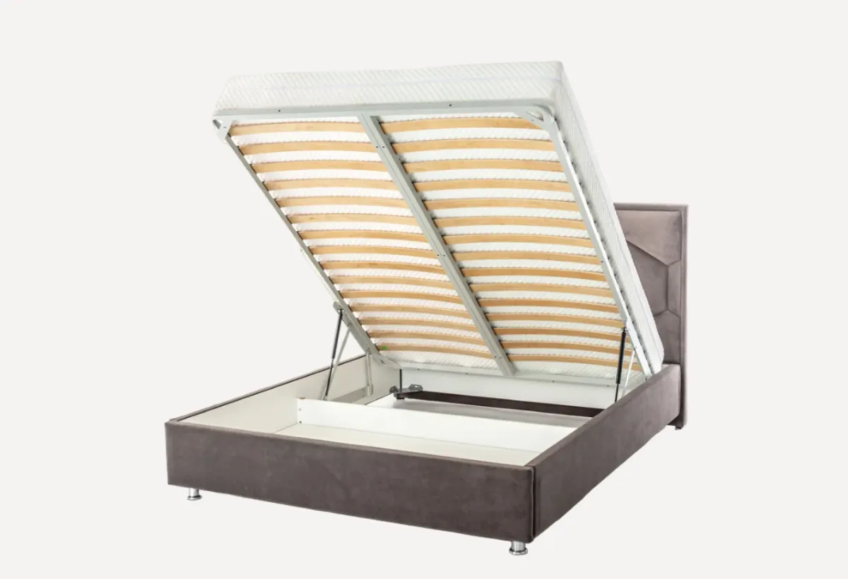 На основу изголовья из ДСП толщиной 16 мм крепятся элементы из МДФ толщиной 10 мм, оклеенные поролоном толщиной 40 мм и обтянутые мебельной тканью. Пазл из мягких элементов обрамляется мягкой рамой, также обтянутой мебельной тканью, а обратная сторона изголовья закрыта спанбондом. Царги кровати и ножная спинка изготавливаются из ЛДСП толщиной 16 мм белого цвета, с усилениями из брусков ДСП толщиной 16 мм, прикрепленными к внешней стороне. Вся конструкция с наружной стороны оклеивается поролоном толщиной 10 мм и закрывается спанбондом. Внутри каркаса устанавливается поперечное ребро жесткости, которое сохраняет геометрию каркаса кровати и придает ему дополнительную жесткость. В случае комплектации кровати подъемным механизмом, ребро жесткости служит стенкой для короба для белья. Детали кровати соединяются между собой при помощи металлического кроватного уголка. У изголовья устанавливается 4 уголка, обеспечивая дополнительную жесткость. Металлические уголки также служат опорой для установки ортопедической решетки. Для предотвращения резких звуков при взаимодействии ортопедической решетки с металлическим уголком, на уголки наклеиваются специальные фетровые пункты.